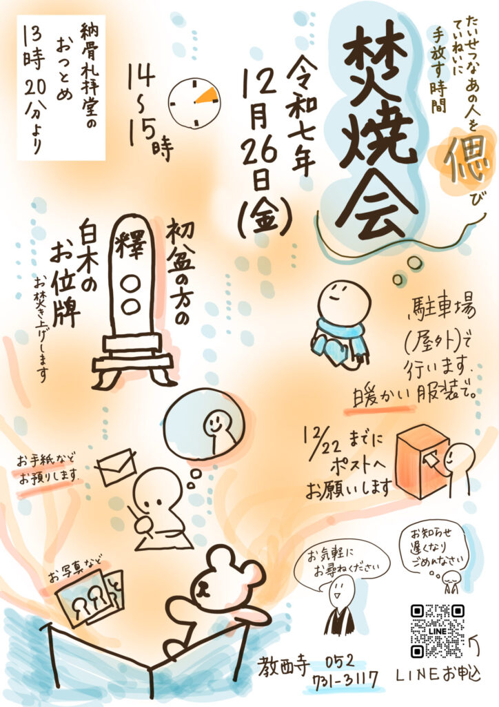 年末に、大切な人やものを偲びます。お位牌、お写真、お手紙、お人形など、大切なもの、丁寧に手放したいものを、お焚き上げします。