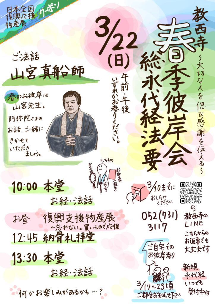 | 行事・イベント名 | あなたの大切な方、ご先祖さまに感謝を伝える日。春季彼岸会・総永代経法要 |