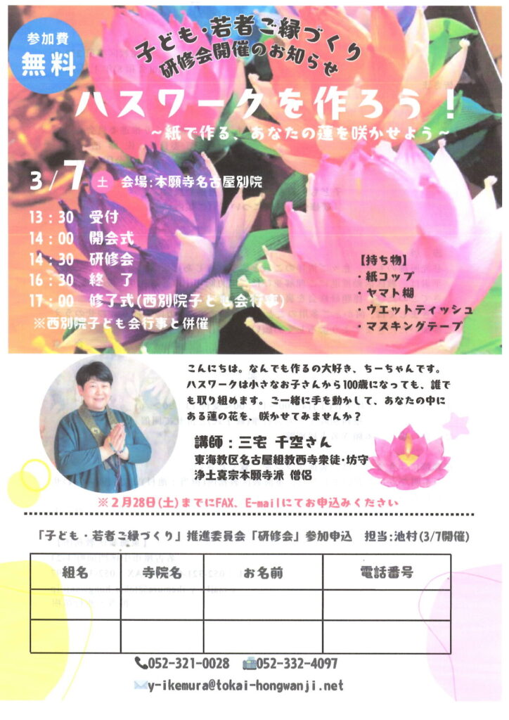 | お申し込み方法 | 西別院(担当:池村)へ電話(052-321-0028)、メール(y-ikemura@tokai-hongwanji.net) |