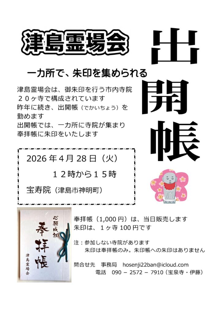 さて、昨年に続いて、出開帳を催します。一度に朱印をいただけます。ただし、不参加寺院があるかもしれません。